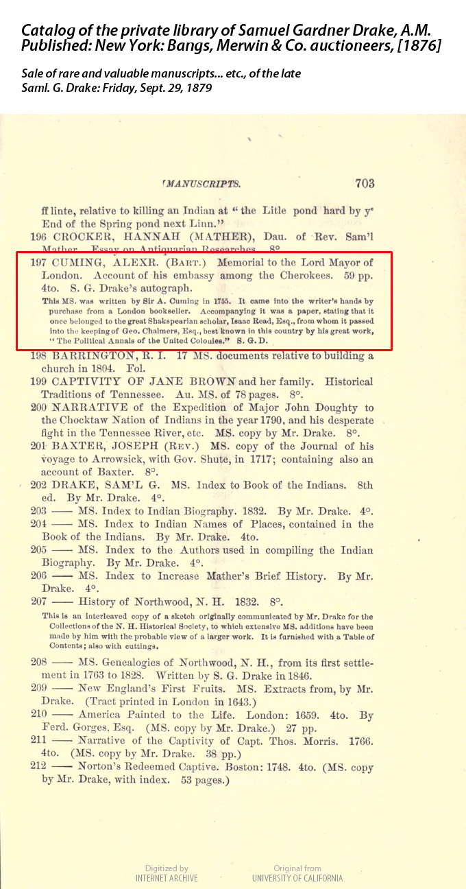 The principal object of this paper is to detail an early embassy to the country of the Cherokee Indians ; the chief authority for which is a MS. written by Sir Alexander Cuming, Bart., in the year 1755, the ambassador himself. This MS. came into the writer’s hands by purchase from a London bookseller. Accompanying it was a paper, stating that it once belonged to the great Shakesperian scholar, Isaac Read, Esq., from whom it passed into the keeping of George Chalmers, Esq….