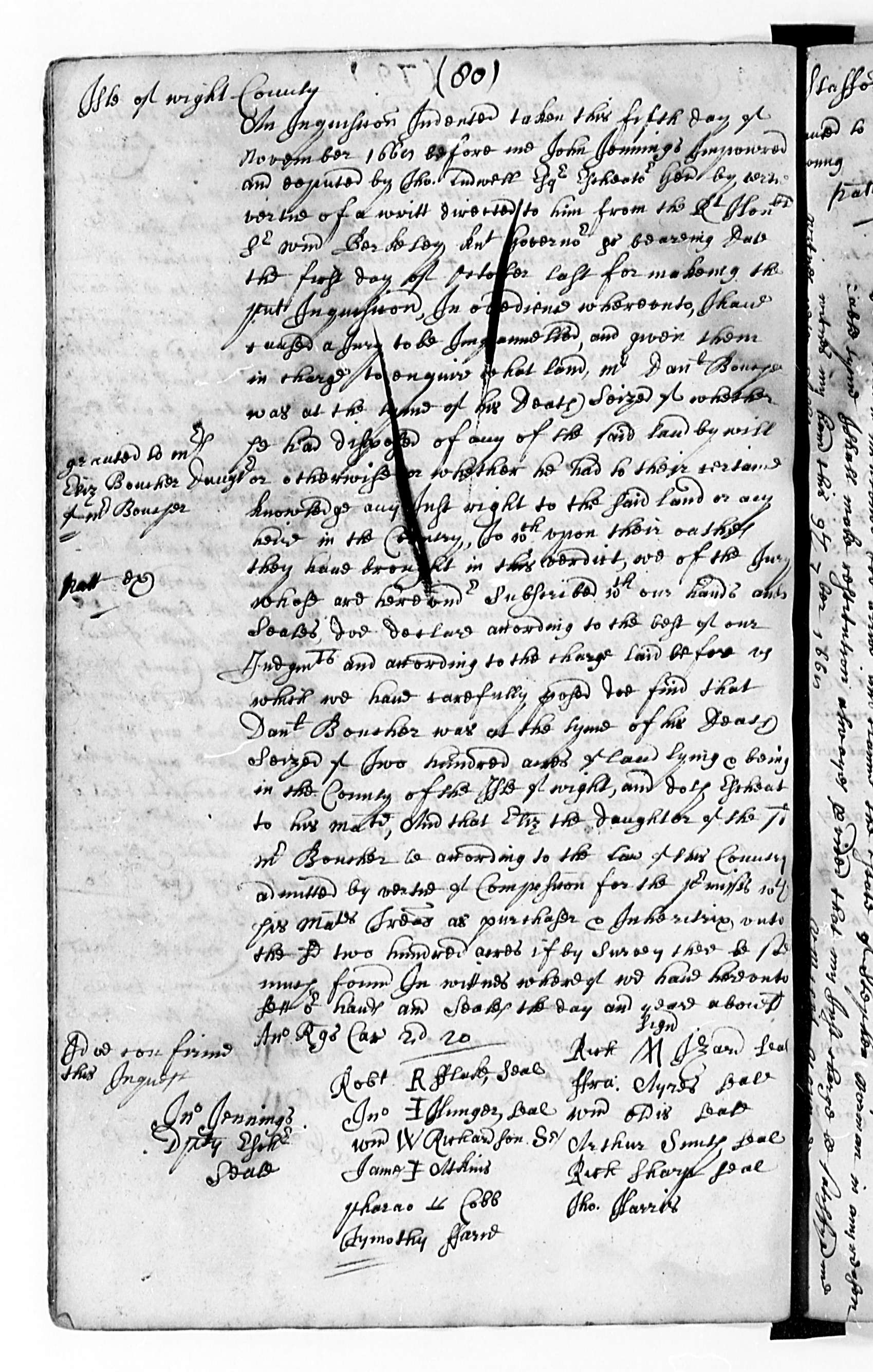 An Inquisition Indented taken this seaventh day of June in ye yeare our Lord God 1670 before me Wm Alford Gent: Deputy Escheator of ye County aforesd by testes: of a Writt to me directed from ye Rt Honble William Berkeley Knt Genle & Capt Genll of Virginia __? __?__? in ye Country dated ye first of March last past first makeing ye present (patent?) Inquisition, In obedience where unto I have caused a Jury of yt Neighborhood to be impannelled and given them in Charge to inquier what lands John Garrett of ye County aforesd was at ye time of his death seazed of whether hee had [to any of their Certaine knowledge][crossed out] disposed of any of his sd lands by Will or otherwise, as whether hee had to any of their Certaine knowledge any heire in ye Country or whether hee was an Alien or freeborn subject to wch upon their oathes they have brought in this verdict first wee of ye Jury whose names are hereunto subscribed with our hands & seales doe declare according to ye best of our Judgmtt & according to ye Charge layd before us wch we have carefully pased? doe find yt ye sd John Garrett dyed seized of four hundred acres of land granted to him by pattent dated ye five & twentieth day of July 1640: wch land ye sd John Garrett did by his will dated ye twentieth day of September 1655 devised unto Margarett his wife who afterwards married unto Coll Thomas Colley & hee since dyeing as (well?) (and was?) intestate and finding noe heir in ye Country to our Certaine knowledge ye sd land being now in ye possession of Edward Dyson? (Edward Ison perhaps-see margin note) who purchased ye same? in his owne- wrong of ye sd Coll Colley of right (sic) doe therefore give verdict yt ye sd land doth Escheatee to his Sacred Ma:tie to wch verdict doe hereby Confirme ye same & together wth ye sd Jury have signed & sealed two of this present date & contents? and doe hereby Certifie ye same unto his ___? treasurer according to ye terms? of ye sd Writt into ye secretaryes offices