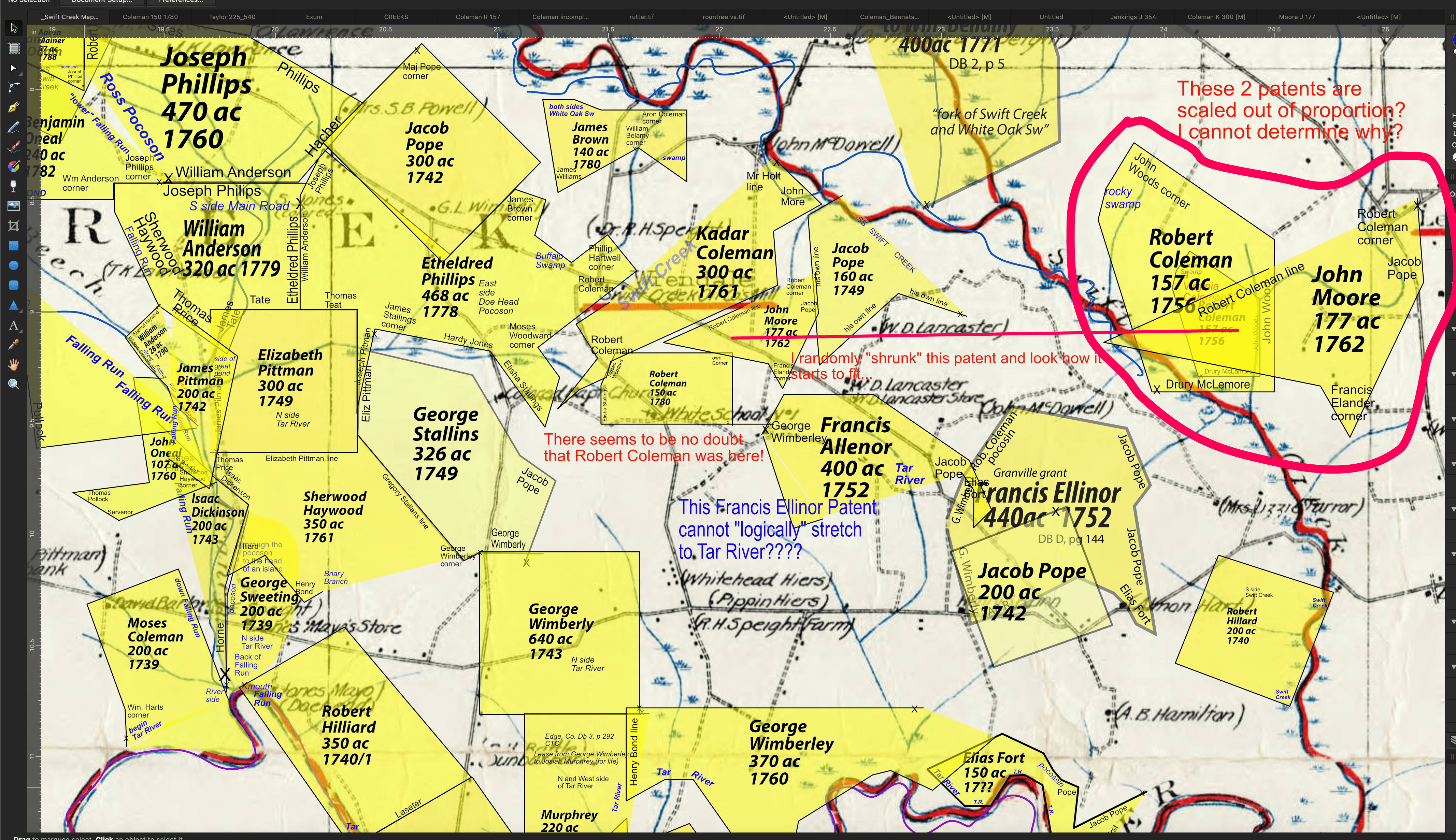 So I am analyzing a patent dated 1739… it has a reference to a creek named “Coneho”. So I think hmmm, that is near Tarboro I think? And then it dawns on me to think 1739… they could not Google Map then.