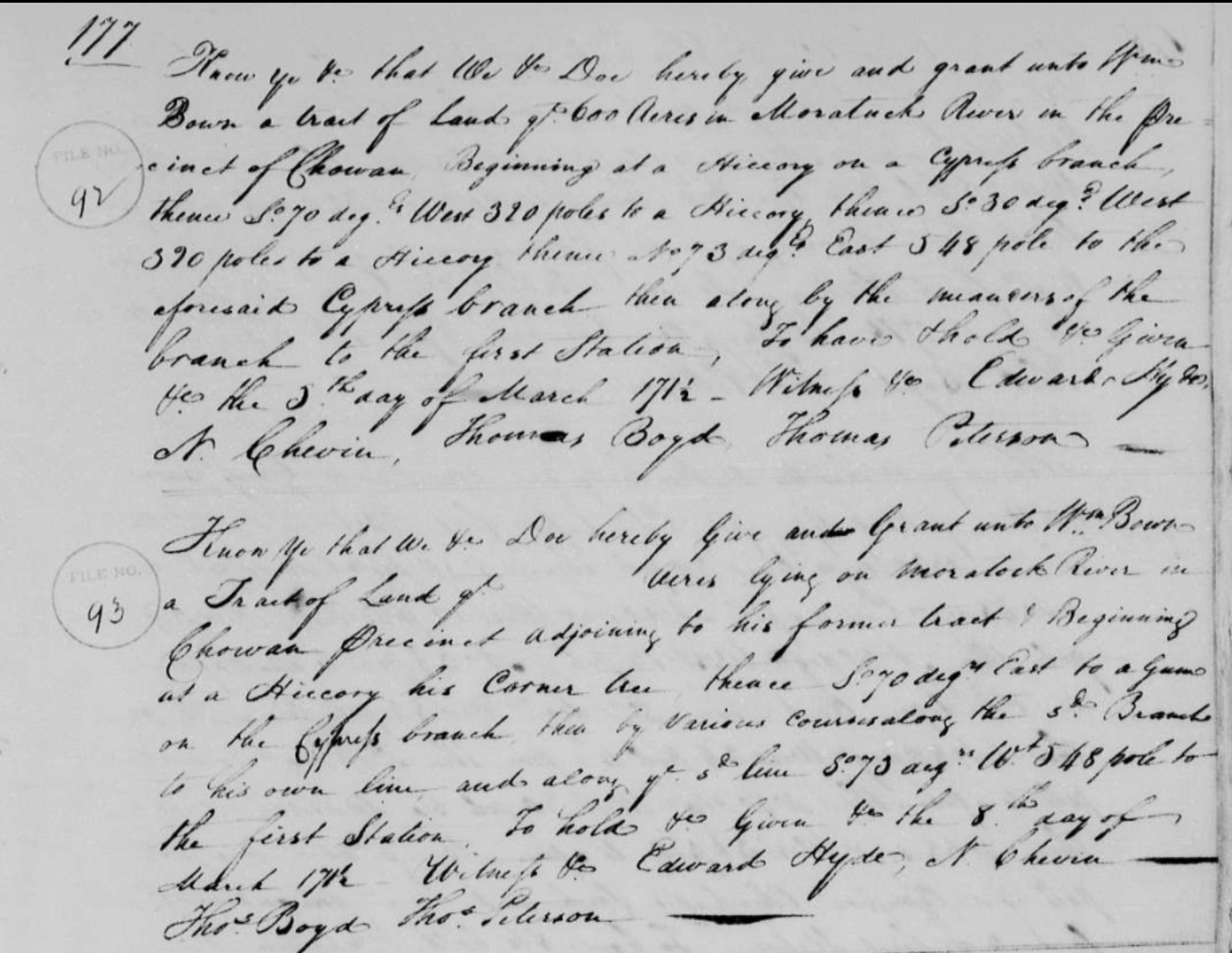 NARRATIVE: Wm. Brown was issued Unknown acres of land on 08 Mar 1711 in Chowan County, located “On Moratock river”. This was recorded in Land Patent Book 1 page 177 as Chowan County Grant # .